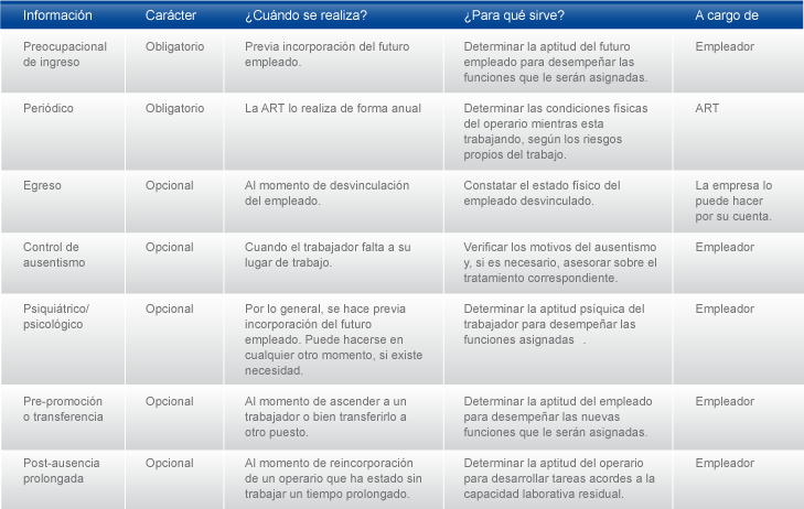 Por ley, los exámenes obligatorios que deben efectuarse a los RRHH son el preocupacional, a cargo del empleador, y el periódico, a cargo de la ART.